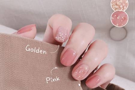 這_美甲需要三種甲油,白色大閃片甲油、金色小閃片甲油、水粉色。先在指甲上涂上兩層水蜜桃粉色,用金色點綴甲面,選擇一個指甲,在之間涂上大閃片。指甲充滿層次感,溫柔水嫩,是非常顯白的粉色調。