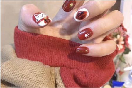 啞光車?yán)遄拥念伾哂袝r(shí)尚感,金色鉑片黏貼在上面。倒立的福字結(jié)合傳統(tǒng)的喜慶元素,_適合做過(guò)年時(shí)候的美甲。在大拇指上用白色填充招財(cái)貓的形狀,畫出貓咪的五官和胸口的叮當(dāng),_后用透明甲油保護(hù)一層。