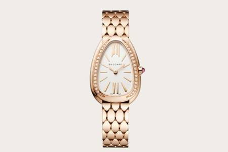 鎏光蛇影腕表造型_,以玫瑰色金質打造成腕表,鵝卵石形狀的表盤適合女生的氣質,手腕更顯纖細。蛋白石表盤_纖薄,周圍是一圈鉆石。表鏈以蛇形鱗片為造型交疊在一起,打造驚艷的迷人造型。