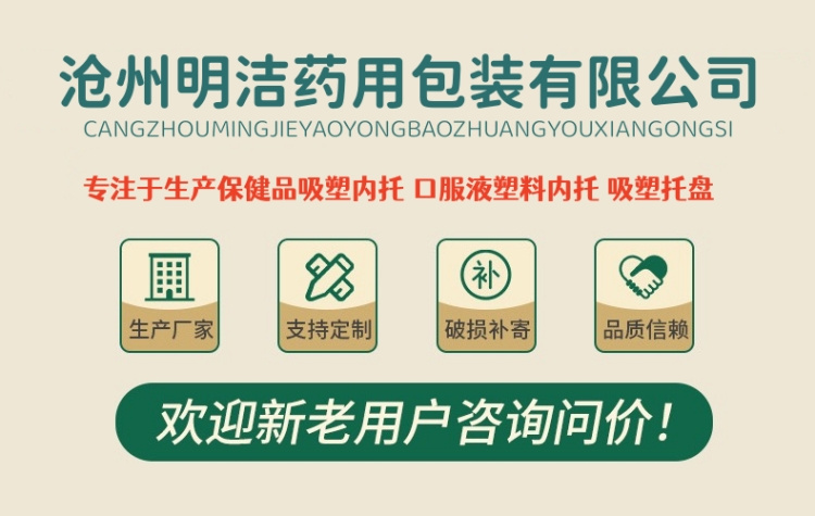 滄州明潔專注于生產(chǎn)口服液塑料托,口服液吸塑內(nèi)托,口服液塑料托盤,保健品吸塑包裝,醫(yī)藥吸塑盒,吸塑內(nèi)襯,藥用塑料托,藥瓶托盤,PP/PVC/PS/PET/BOPS吸塑包裝制品,用心選材,規(guī)格眾多,款式新穎,質(zhì)量過(guò)硬。