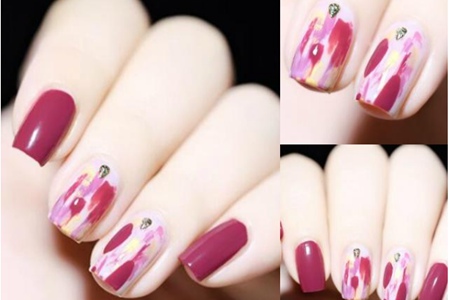 桃紅色和絳紫色的水彩指甲頗有古典感,用黃色和粉色做底層的暈染,絳紫色將在上層點(diǎn)綴,以小鉆作為裝飾,這個(gè)甲面華麗多彩,層次感明顯,而且也不會(huì)顯得復(fù)雜。