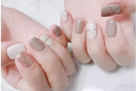 白色適合短指甲造型,小面積的白色具有仙氣的感覺,在中間點(diǎn)綴一條金銀條,間隔出空間感?;疑徒鸹疑奶|(zhì)感_,適合成熟的女生。