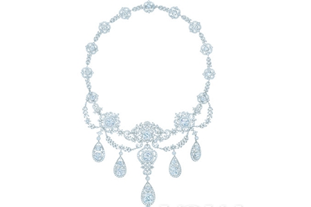 這_華麗的項(xiàng)鏈來自于杰普撒·荷馬·韋德二世送給伴侶的禮物。通透的鉆石在白金的串聯(lián)下打造出花環(huán)的形狀,水滴形的造型縈繞在脖頸上,純潔美好一如不變的愛情。繁復(fù)的花紋組成花草的形狀,貴重金屬卻有著輕盈的質(zhì)感,紋理間的鏤空極為巧妙,是_品項(xiàng)鏈的傳世之作。