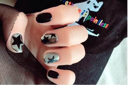 藍(lán)灰色的鏡面帶來夢幻的感覺,星星占據(jù)了大半的指甲,在周圍畫出勾邊會讓星星有浮起來的感覺,形狀變得更加有層次感。黑色和藍(lán)色的搭配沉穩(wěn)又霸氣,具有cool girl的感覺。