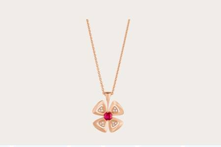 寶格麗的詠綻系列了以羅馬永恒花朵作為靈感,用紅色寶石作為花卉的象征,帶來熱烈的情感。這_玫瑰金項鏈以四朵花瓣為形狀,每一朵花瓣有三顆鉆石,中間是一粒圓寶石點綴,展現出女性_的鎖骨。