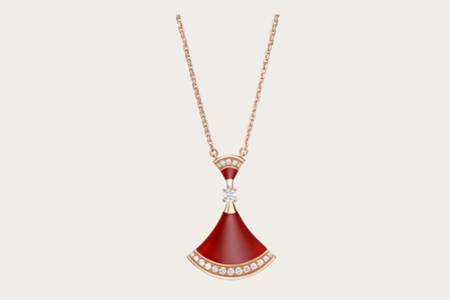 DIVA’S DREAM是寶格麗_負盛名的一個系列,紅玉髓項鏈極為尊貴典雅,對稱的扇形以一個鉆石連接。以玫瑰色作為寶石和鉆石的銜接,打造具有古羅馬審美的項鏈。