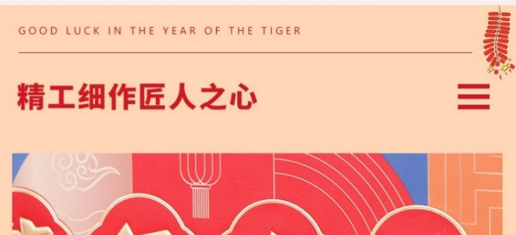 多種組合的吉祥禮盒,或繁或簡,或大或小,豐儉由人。吉祥平安,除舊迎新,歡樂喜慶, 結(jié)彩張燈的主題,祝頌著新年的福祉。愿我們的用心之作,滿載著新春好禮,給您的節(jié)日帶來快樂、喜悅和吉祥!